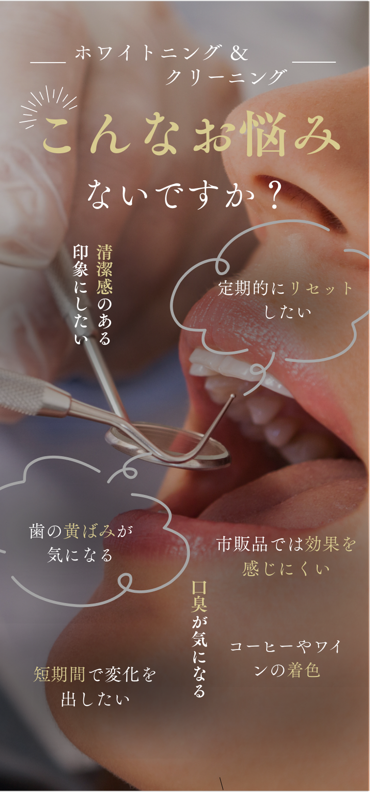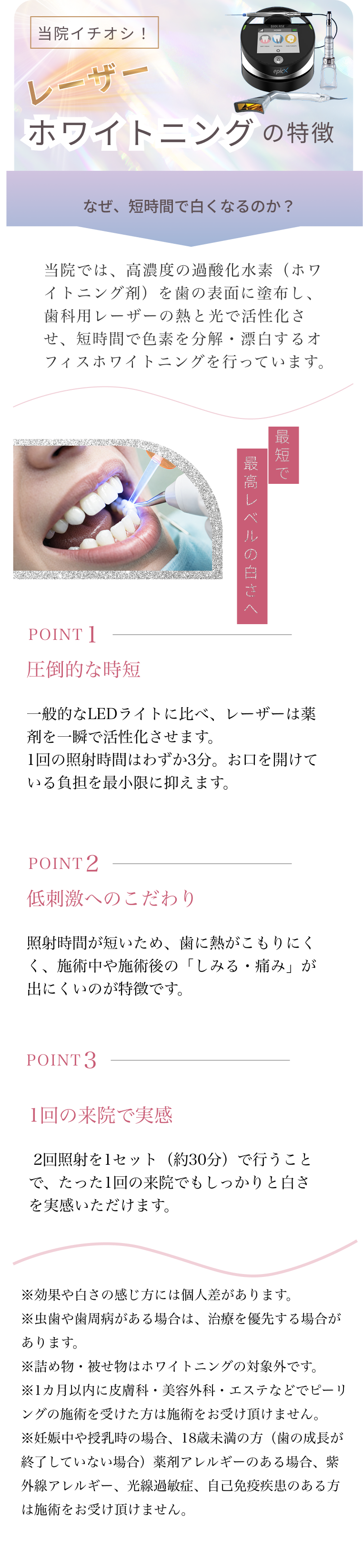 レーザーは照射時間が極めて短いため、熱による刺激が少なく、痛みが出にくいのが特徴です。知覚過敏がある方は事前に保護剤を使用するなどの対応も可能です。