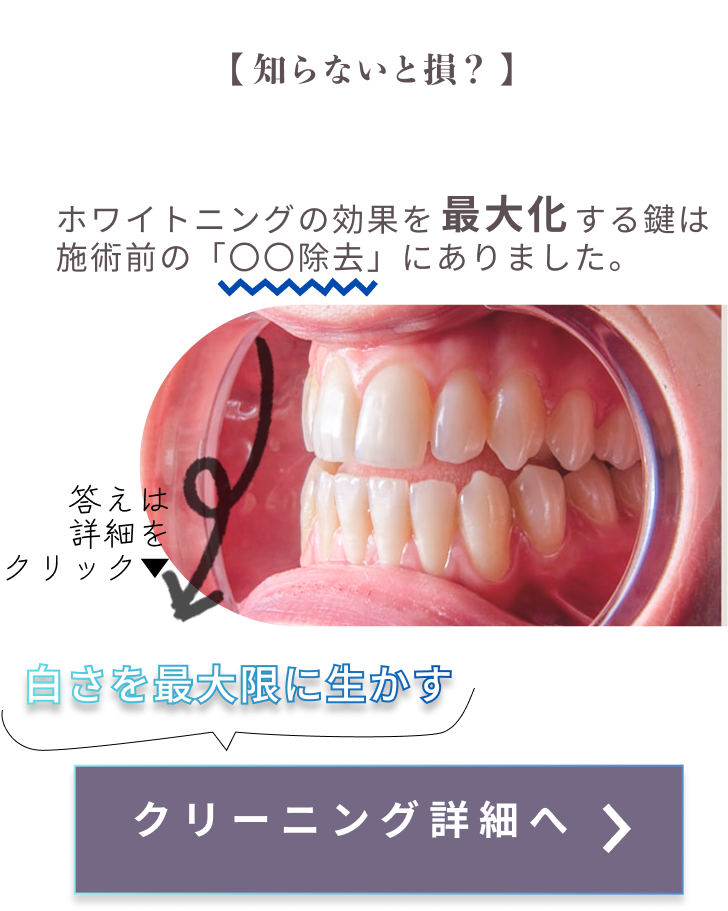 日本の薬機法では市販品に漂白成分を配合することが禁止されています。市販品は表面の汚れを落とす「クリーニング」ですが、当院の医療ホワイトニングは歯そのものを「漂白」します。